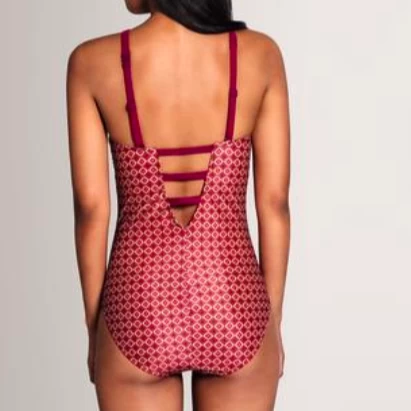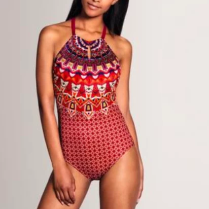 The Manda One Piece Swimsuit from Amoena is adorned with a stunning, vibrant pattern that was inspired by Barcelona. The high neckline is designed to cover scars or radiation sites, whilst bilateral pockets accomodate swim prostheses if needed. The strap detail at the back shows skin but still provides support, and convertible straps at the neck can be worn straight or as a halterneck.Â