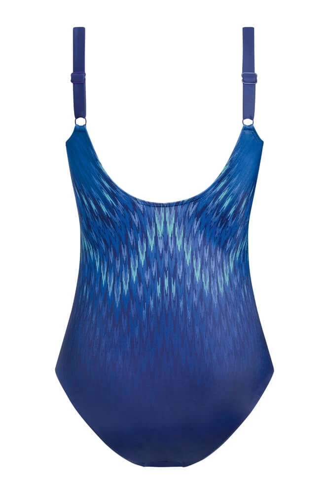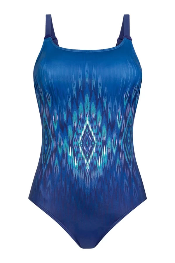 This stunning one piece swimsuit from Amoena has comfortable, adjustable straps to keep you secure whilst you swim. Bilateral pockets can support swim prosthesis if needed. A beautiful navy and turquoise pattern is striking at the front, and the triangular structure flatters the figure.Â