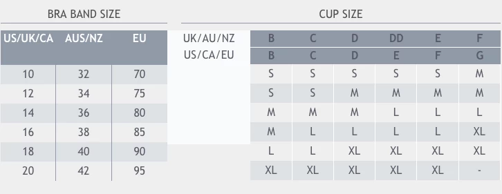 Use the chart included in product photos to convert your bra size for the best fit.Â