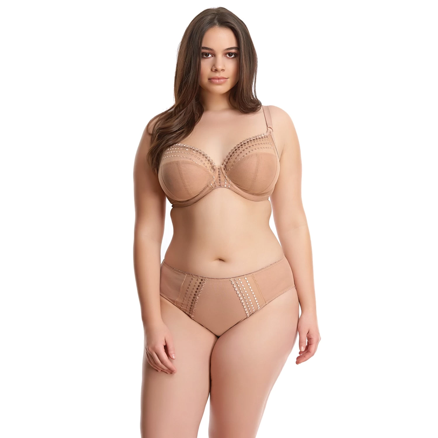 The beautiful Matilda bra from Elomi is designed with a low centre, providing plunge without push up. The three section cup and side panel give a fantastic forward shape with good uplift and separation. The flexible sweeping back to allows for easy adjustment to a racer back with a movable J hook.Â