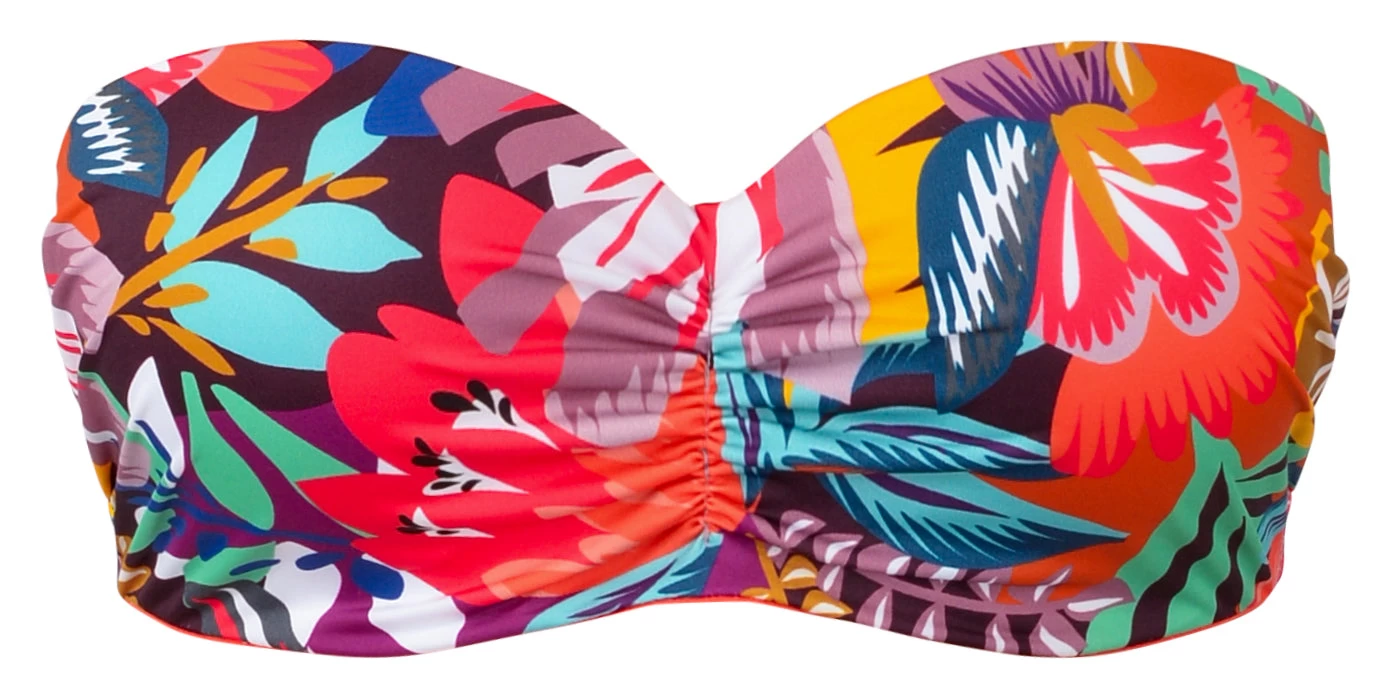 The vibrantly beautiful Sun bikini from Empreinte is summer in a bikini. With a gorgeous multi coloured floral pattern, it is happy and cheerful, perfect for wearing at any time of year, This bikini supports the bust and allows confidence in and out of the water without straps! Please note we have found the cup on this bikini to be generous so you may wish to size down a cup size.This bikini also comes with straps.