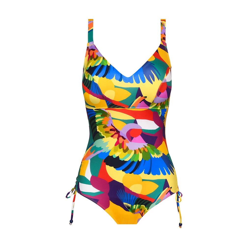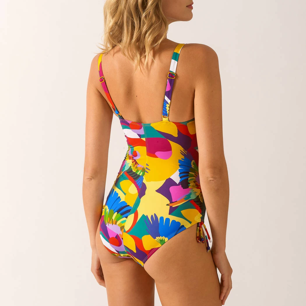 The Empreinte Paradis swimsuit is a pop of colour to take you from the sidelines straight into the water. With a striking print adorning it, this swimsuit is vibrant and fun whilst still providing support and structure to keep you secure whilst you swim. The sides of the swimsuit feature a tie at the bottom, allowing you to ruche for minimal, or maximum coverage as you choose. The front of the one piece is lined for opacity and modesty, whilst the elastic band under the bust provides support.Â