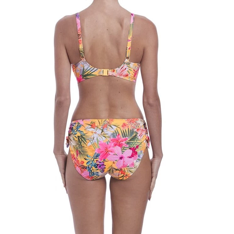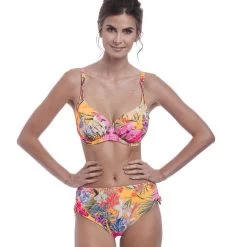 The Anguilla bikini top from Fantasie features a luscious tropical print. The full cup, underwired structure of the bikini provides great support to all shapes and sizes of bust, ensuring you feel confident in the water. Wear with the matching Anguilla print bikini briefs for a bright and summery swim set.Â