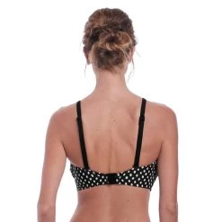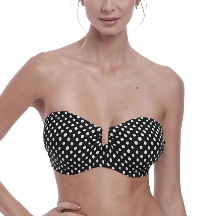 This chic, monochromatic bikini top from Fantasie will pair perfectly with the matching Santa Monica briefs. Textured Spanish pique fabric with a black and white polka dot print is ever so flattering. The bikini features a plunging neckline which flatters the bust, with a concealed underwire, powernet wings and lined cups for support. The straps are adjustable and able to be worn crossed or straight over the shoulder.Â