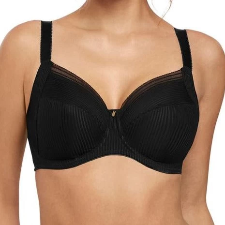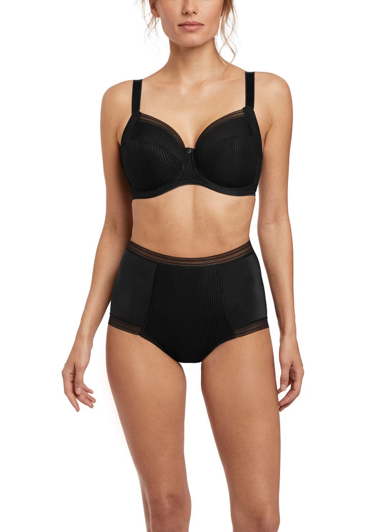 Indulge in everyday elegance with Fantasie’s Fusion Full Cup Side Support Bra, designed with modern fabrics and wide wires that offer comfort and support. The top of the cup has an elasticated trim sitting flat a the neckline to accomodate a fluctuating bust. In striking black, this is the perfect bra for every day wear. Pair with matching Fusion briefs for a stunning set!Â