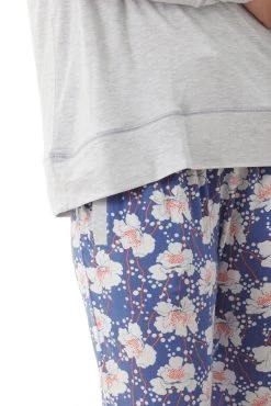 Long ski pyjama with plain contrast grey marle top. Florence Broadhurst ‘Spotted Floral’ modal print in denim blue, red and white. Modal knit is beautifully soft and comfortable. The grey marle top has a round neck, relaxed shoulder, long sleeves, self bands on the body and cuffs. The long pants have a comfortable elastic waist with a drawstring. Grey marle waistband, tie, cuffs, and pocket welts. Pant
