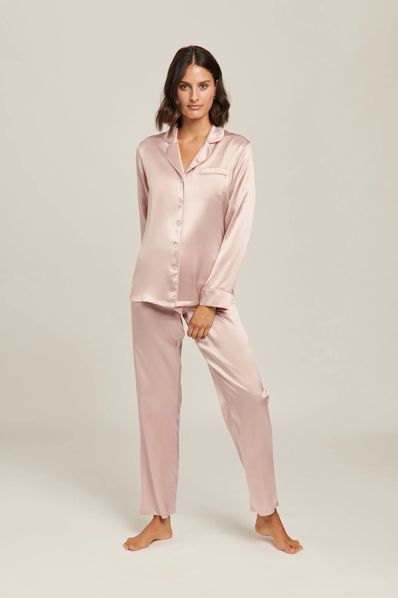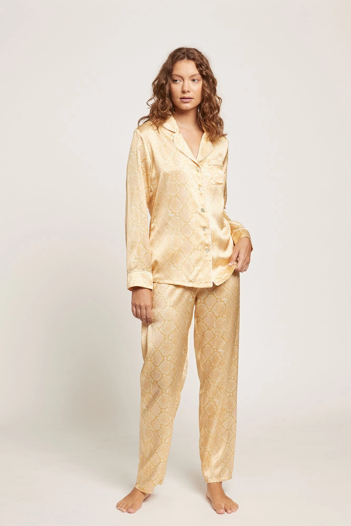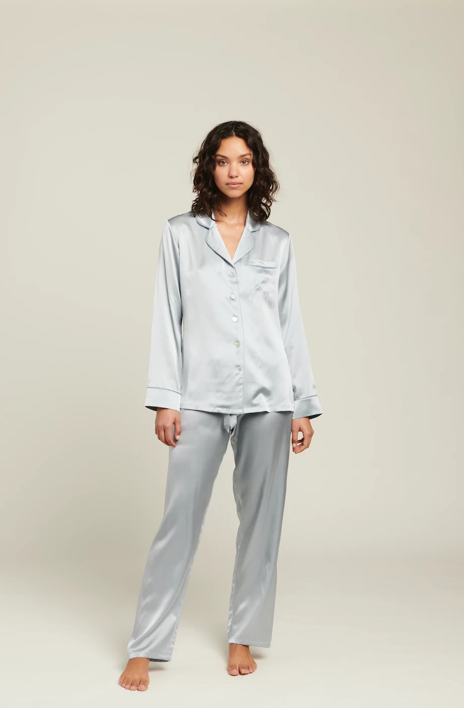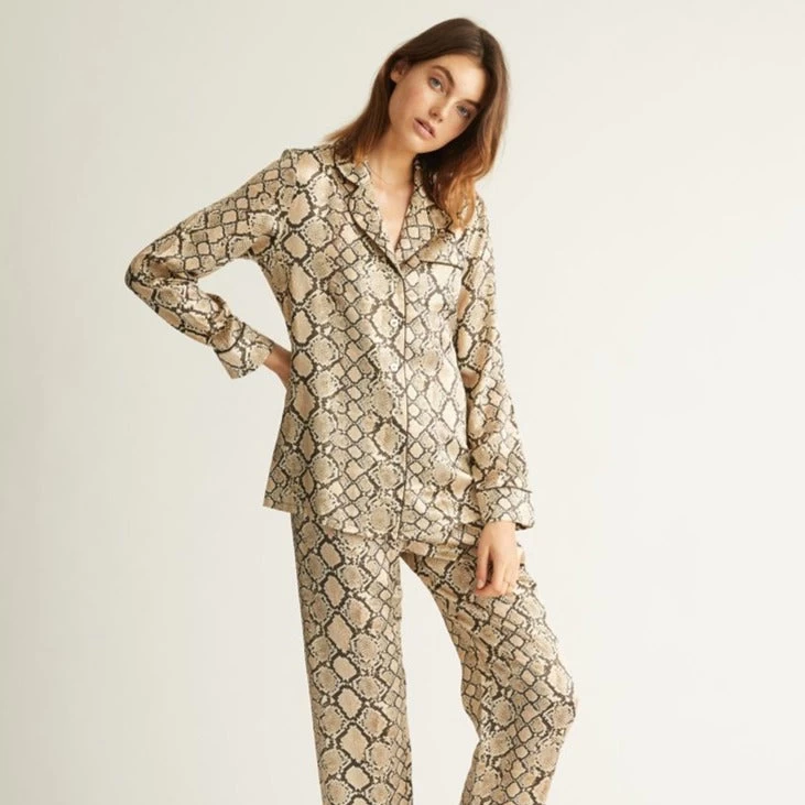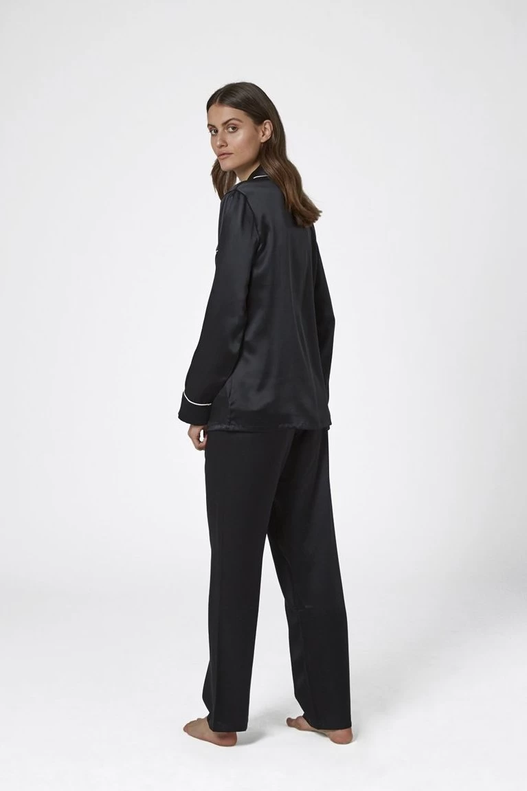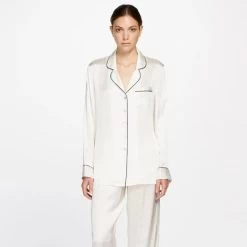 Australian luxury silkwear brand Ginia has crafted these stunning pyjamas from pure silk. Falling gently against the skin, the loose fit is both flattering and comfortable, for an easy loungewear or sleepwear staple. Silk is unique in its ability to keep you warm on a winters night, yet breezy and cool through summer. The pyjamas feature a piped collar and fully opening button down front, with an elasticated waist for comfort and ease. Â