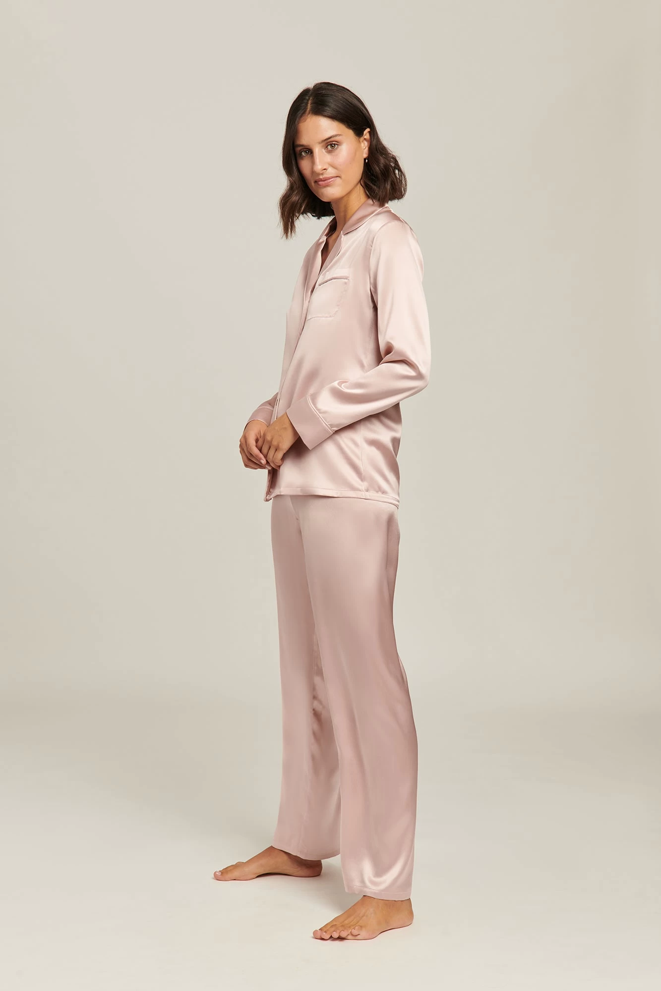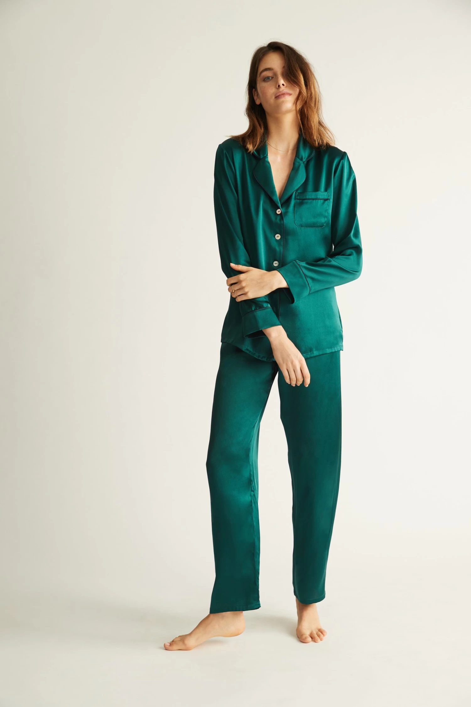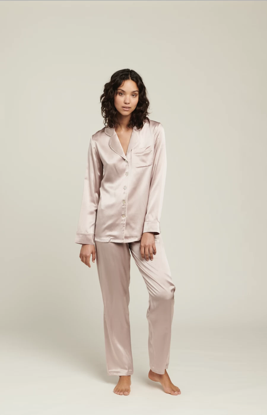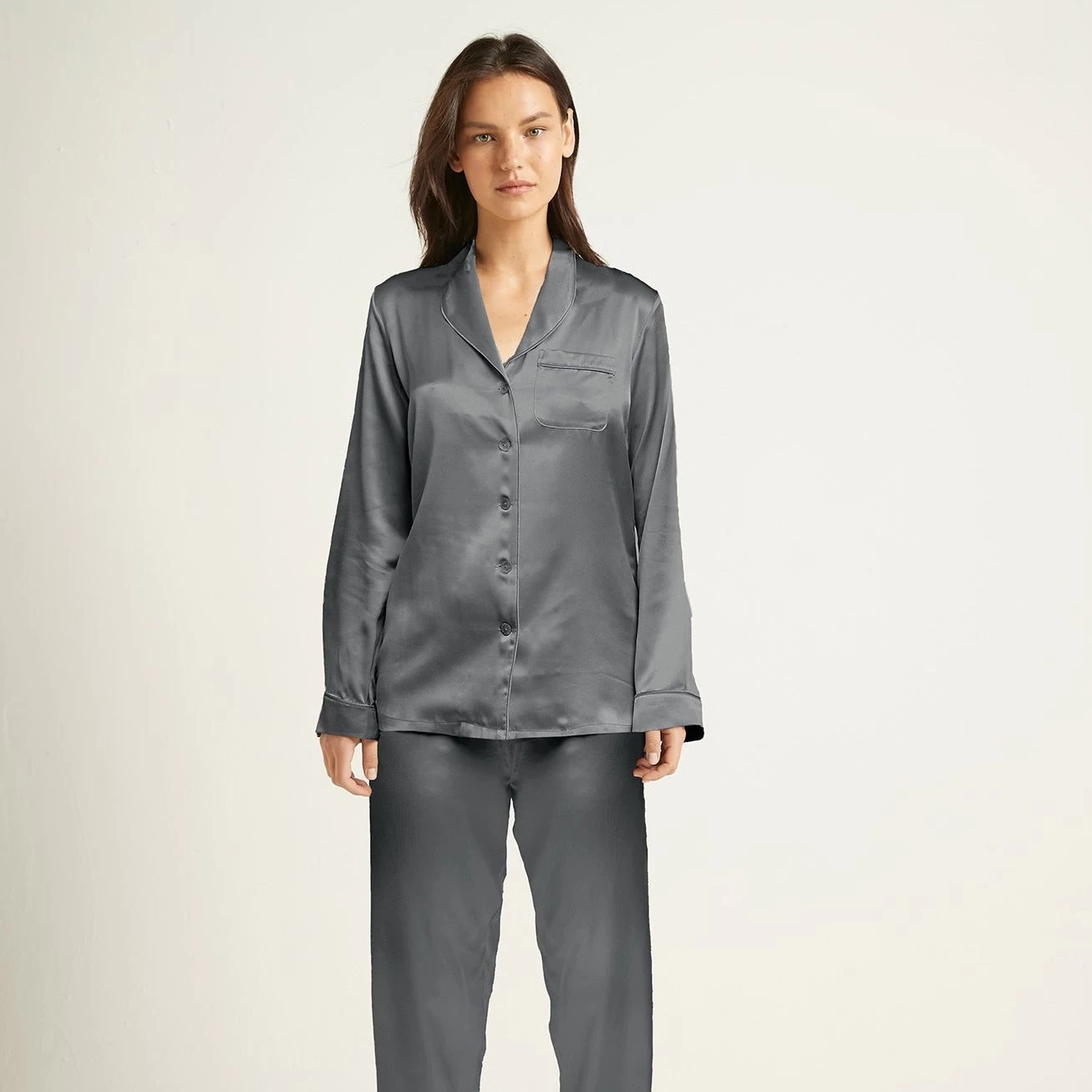 Australian luxury silkwear brand Ginia has crafted these stunning pyjamas from pure silk. Falling gently against the skin, the loose fit is both flattering and comfortable, for an easy loungewear or sleepwear staple. Silk is unique in its ability to keep you warm on a winters night, yet breezy and cool through summer. The pyjamas feature a piped collar and fully opening button down front, with an elasticated waist for comfort and ease. Â