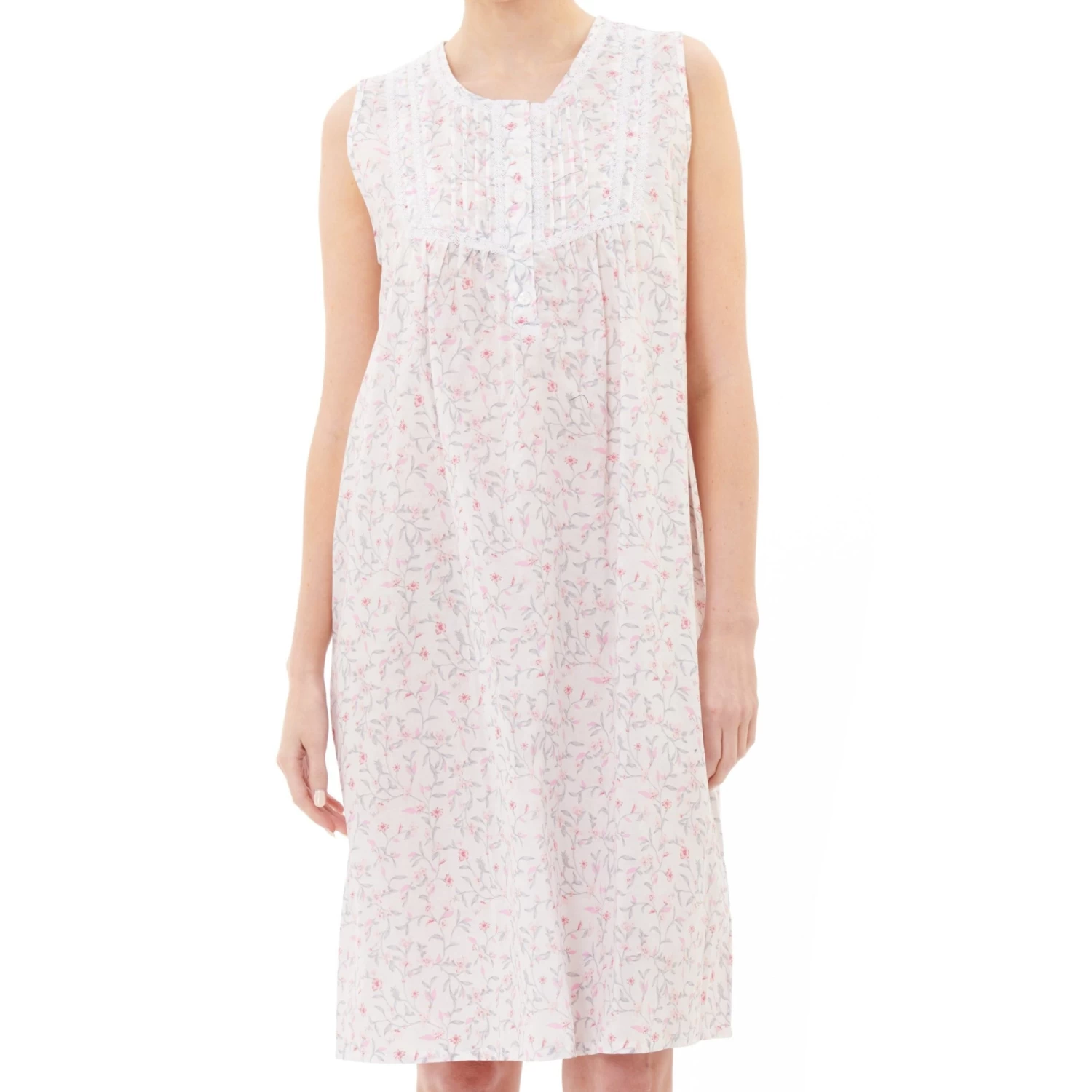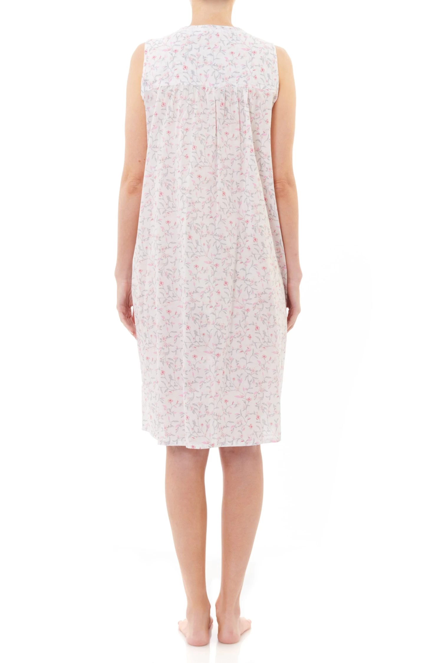 The new Renee sleeveless nightdress from Givoni is made of an ever so soft, light cotton, perfect for wear on a hot summer’s night. The pattern is soft pink florals set against white. The nightie falls to just above the knee, with a row of five buttons down the yoke. White lace at the neckline and yoke adds a feminine touch. Wear with the matching Renee brunchcoat for a coordinated look.