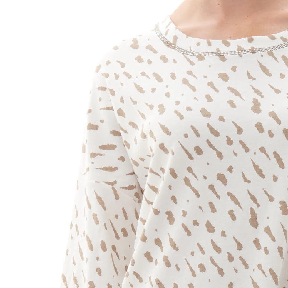 The Givoni Cleo Pyjamas are made from cosy cotton jersey and are perfect for the coldest of nights. Â The fabric is cream with a graphic taupe print reminiscent of animal print. Â The pants are to the ankle with an elasticated waist and drawstring tie for an easy fit, with cuffed ankle.