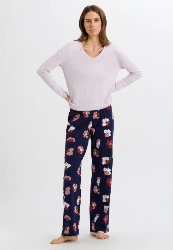 The beautiful Ami collection from luxury sleepwear designer Hanro is a wardrobe classic, sitting beautifully against the figure and flattering to no end. With an easy to wear shirt and loose pant combination, the casual collection is made of a soft interlock cotton that not only feels beautiful against skin, but allows for great temperature control also. These gorgeous floral pyjama pants are a deep navy, adorned with a colourful print that is sure to brighten your day or night. Pair with the beautiful blue Ami shirt to truly bring out the best in the print.Â