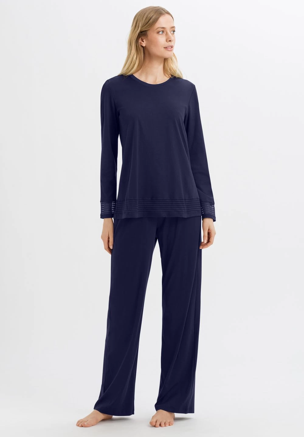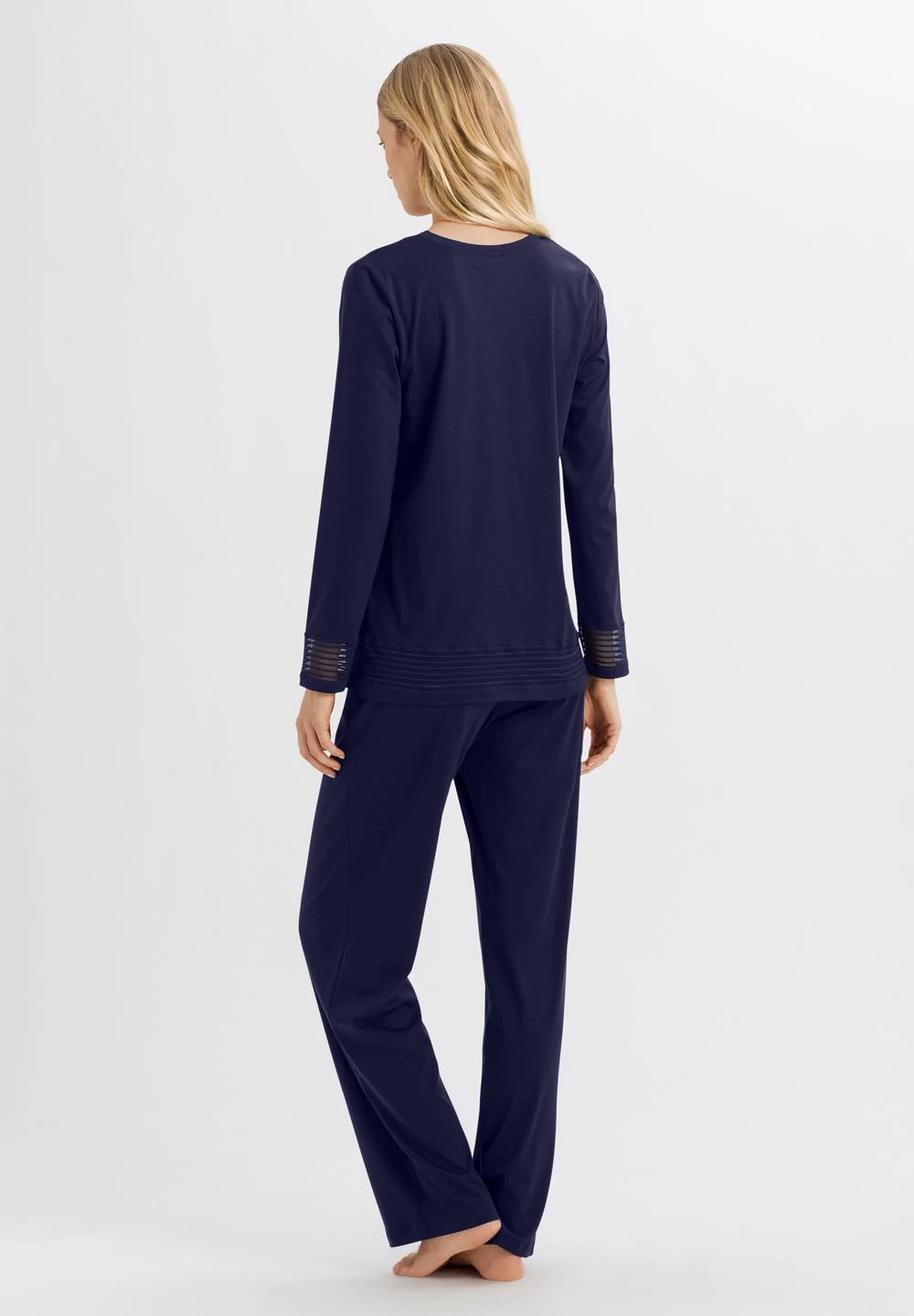 Ira is a new seasonal collection from luxury sleepwear designer Hanro of Switzerland. These long sleeve and long leg pyjamas feature the most beautifully soft mercerised cotton in an interlock fabric. The gorgeous fabric flows against the figure, sitting comfortably whilst still flattering the shape. The bottom of each sleeve and the hem of the shirt are adorned with a classic striated lace set against tulle, giving subtle detailing and adding character to the pyjamas.Â