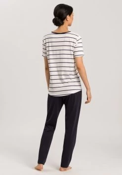 The classic Laura pyjama set from luxury Swiss sleep and loungewear maker Hanro is a wardrobe must have. A round necked short sleeved tee in a classic navy stripe pairs perfectly with cosy long legged pants, complimenting the figure and draping beautifully. The set is made from a soft cotton and modal blend that ensures you will sleep like an angel. The pants have an elasticated waist with a drawstring for ease of wear, with pockets for every day convenience. Wear this set to sleep, lounge, or through your whole day, it’s entirely up to you.Â