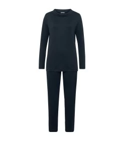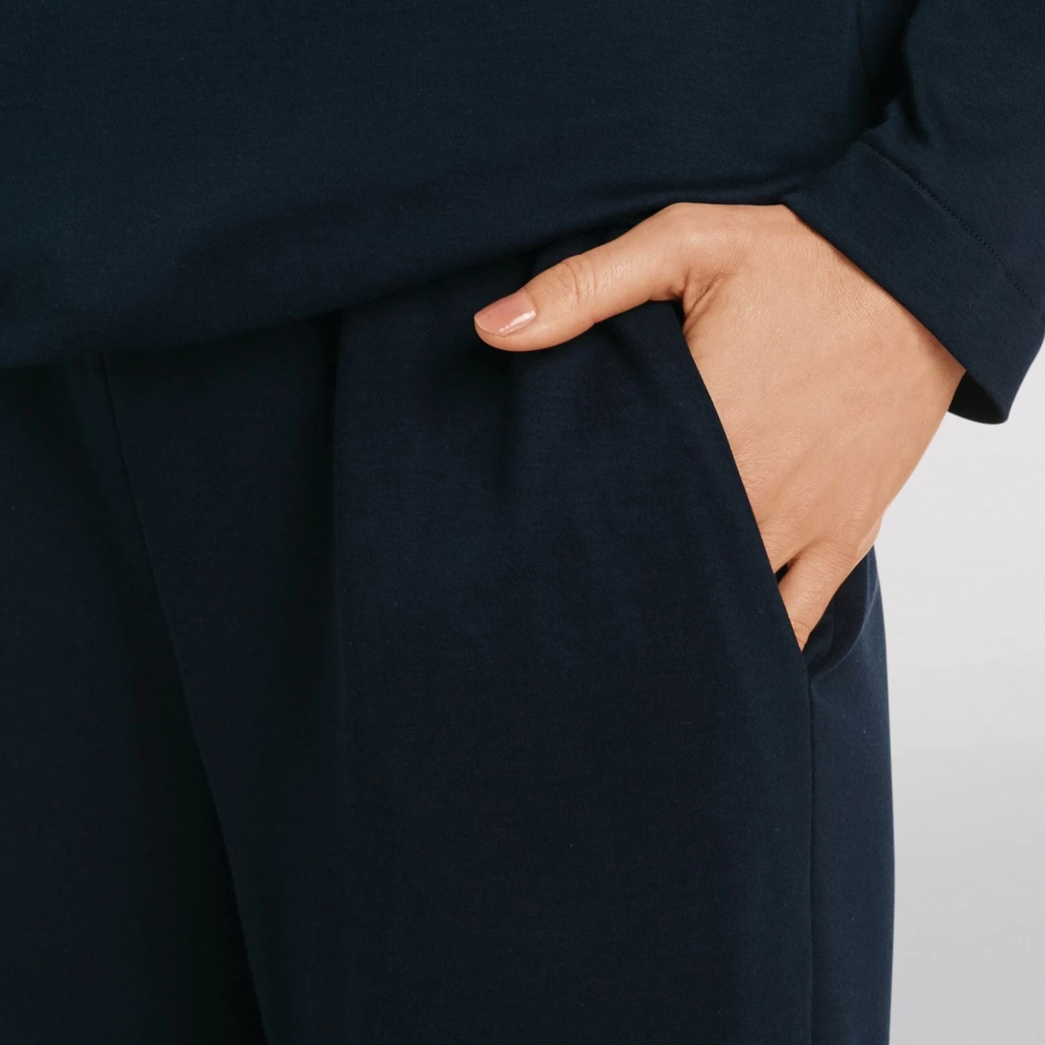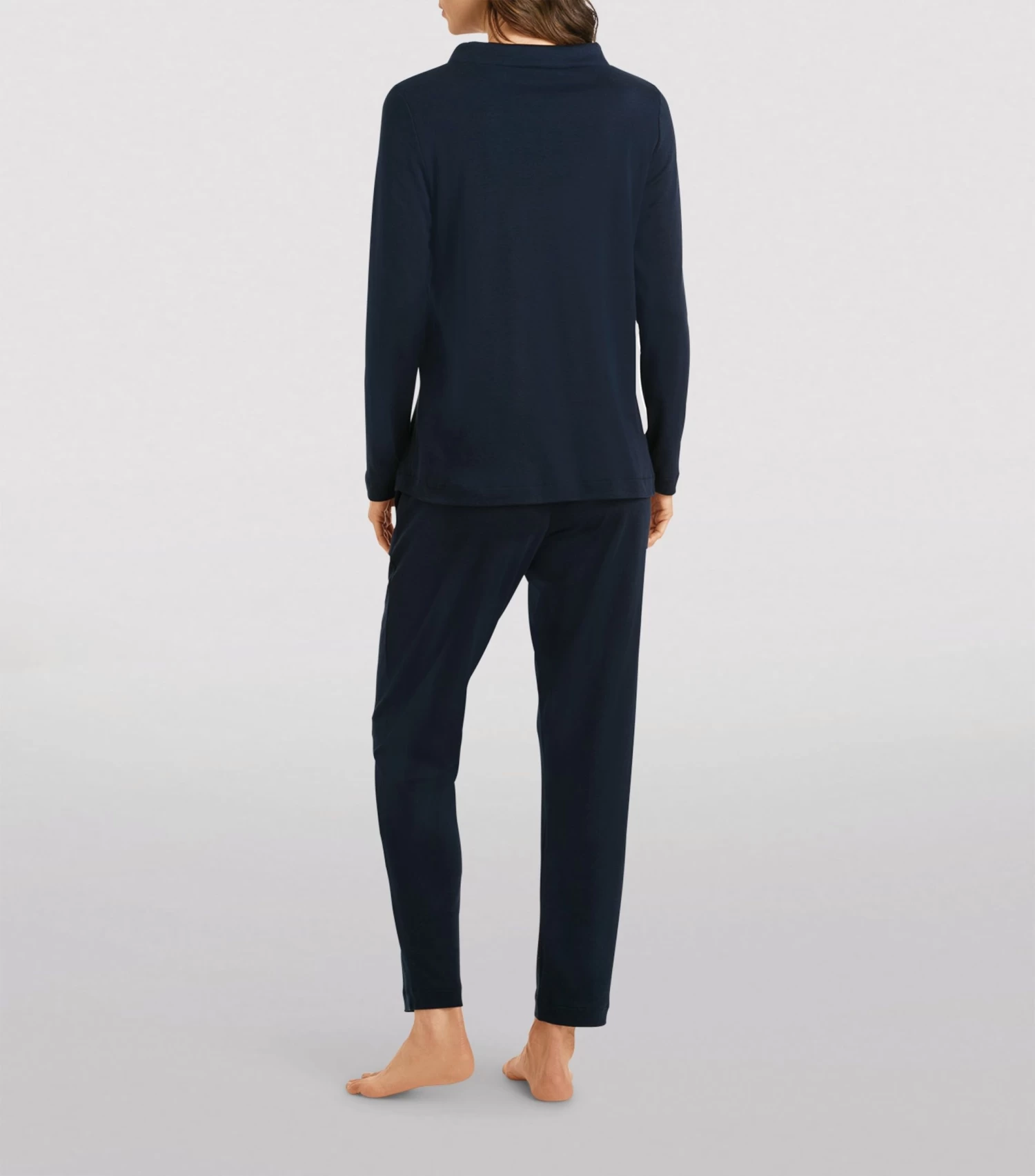 These stunning cotton pyjamas from Swiss brand Hanro is this seasons solution to bridging lounge and sleepwear. The flattering shape of the top follows the figure from the shoulder waist, and then transitions beautifully into the pants. The top features a modern raised collar, and the pants have convenient pockets at the front. They’re made of an ever so soft cotton interlock fabric with a brushed finish inside for the smoothest of feelings against your skin.