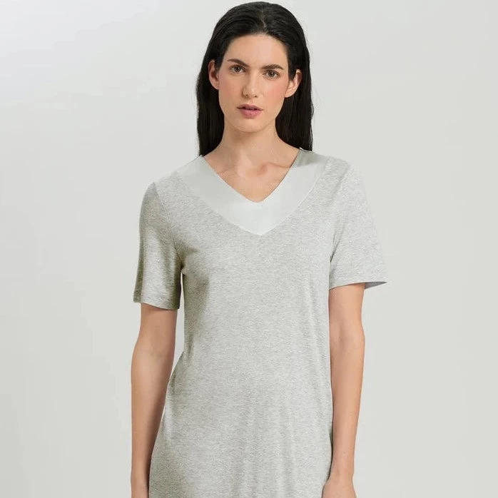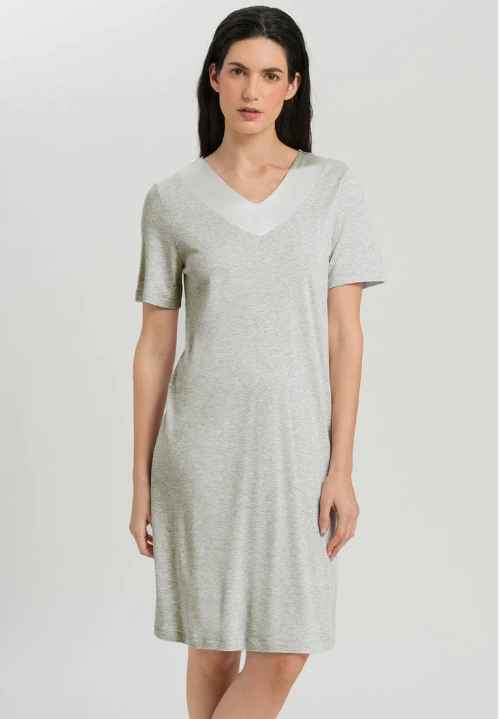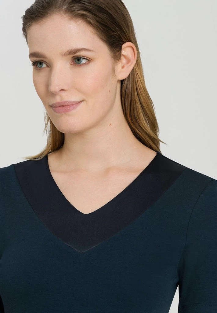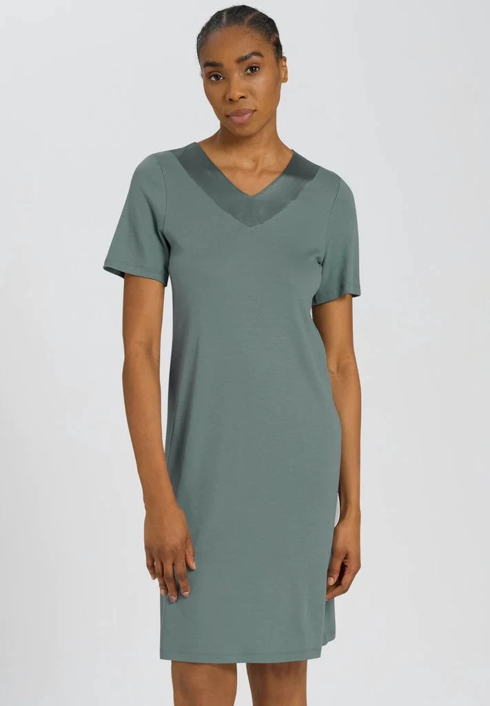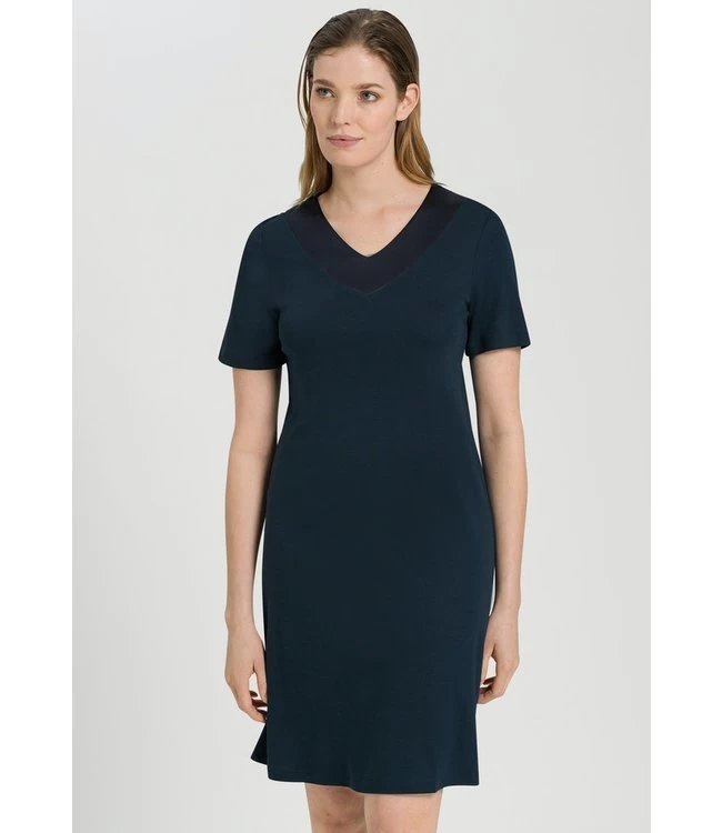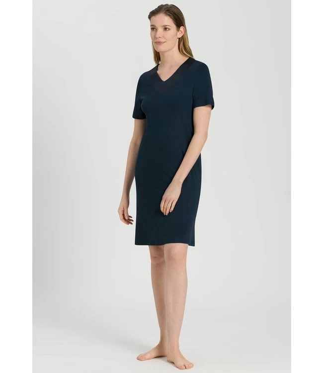 The Mira range of sleepwear from Hanro of Switzerland is elegant and simple in its styling. Short sleeved and sitting just above the knee, the fabric is beautifully soft and completed with a silk v neck trim, It sits softly against the skin all night long, leaving you to get a wonderful sleep. The Mystic Blue is a slightly lighter blue than appears in the images.