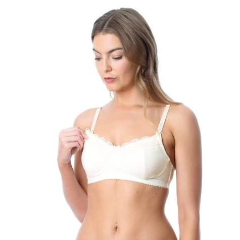 The fantastic Show Off Nursing Bra offers a flexible fit and smooth profile, perfect under any top. A-Frame construction gives support and easy feeding with a one handed detachable nursing clip. A flexible band and fit leaves room for growth. Ivory is a flattering warm toned white.Â
