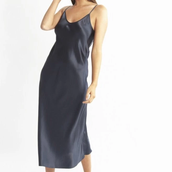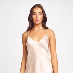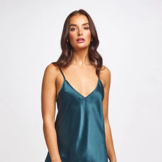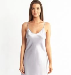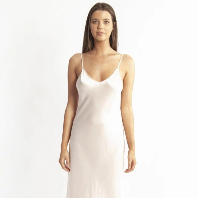 This lovely silk chemise reaches mid calf. it is cut beautifully to flatter the figure. The V neckline is simply lovely.Â