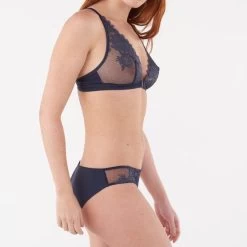 This beautiful front closing bra from Maison Lejaby features soft lace and sheer tule across the cup, with a fabulous racer back making it perfect to wear with your cutaway summer tops and dresses. Available in Horizon Blue and Burgundy.
