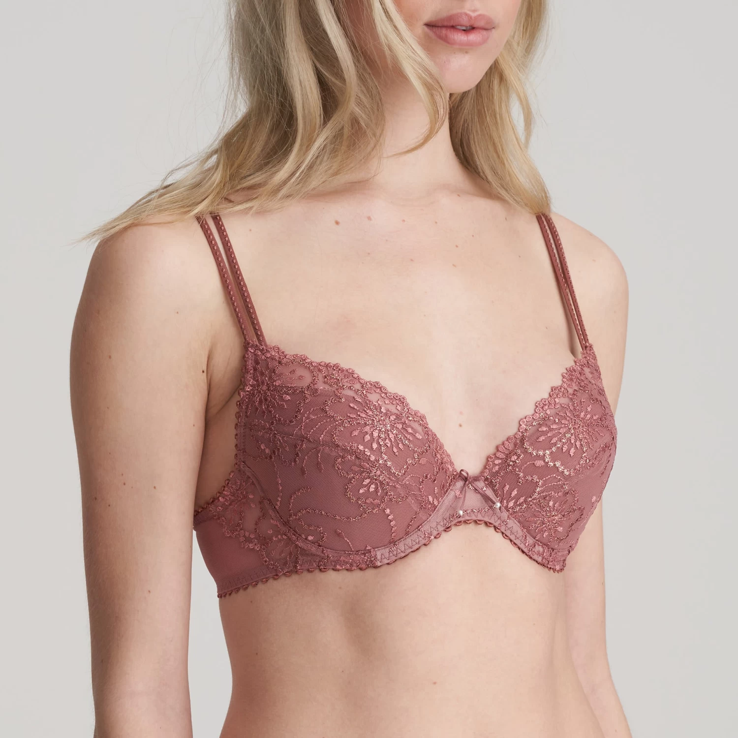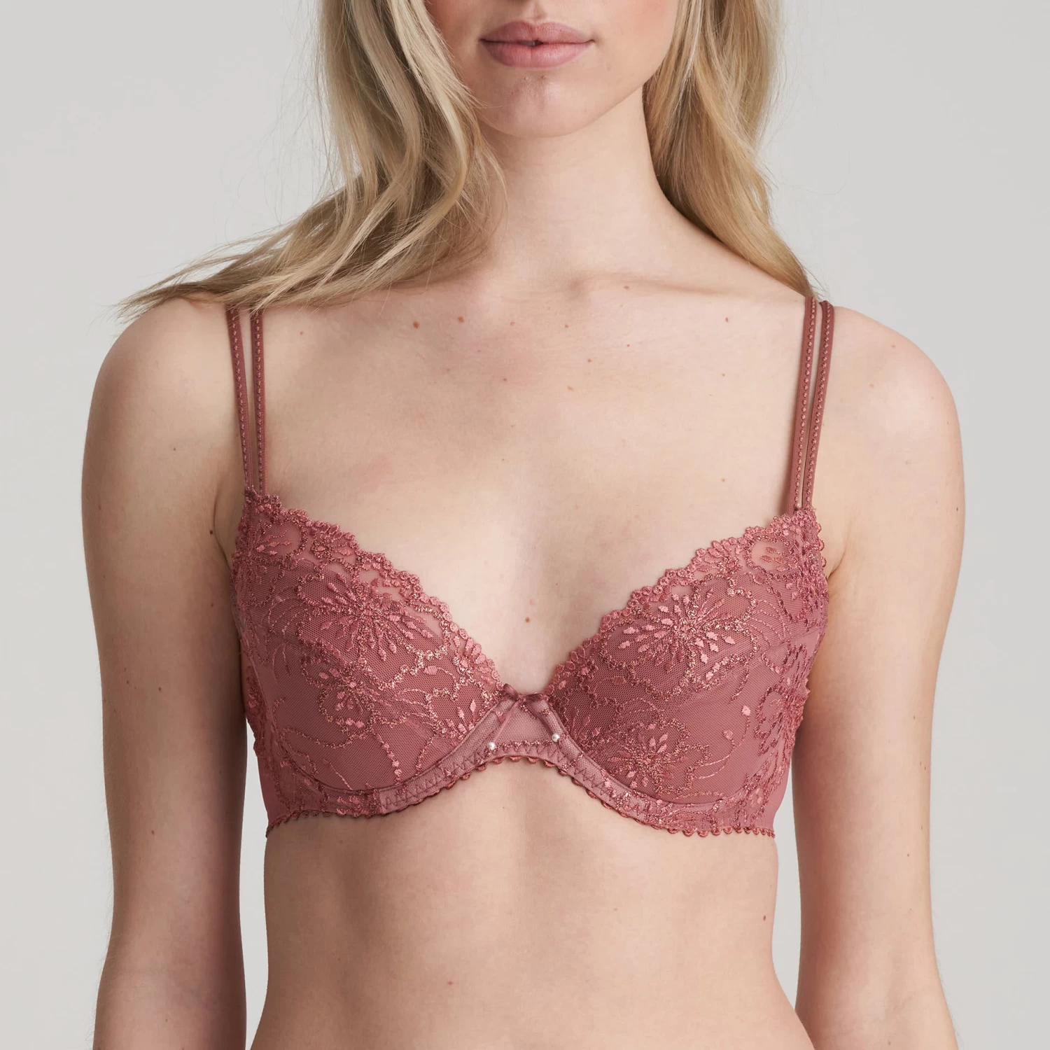 The very essence of seduction, the Jane push-up bra from luxury European lingerie brand Marie Jo creates a sensual cleavage lined with delicate embroidery. The removable padding on the A, B and C cups allows you to choose more or less lift. The D and E cups do not contain the push up padding but give a terrific shape with great cleavage. Pair with any of the Jane briefs for a gorgeous matching set.Â