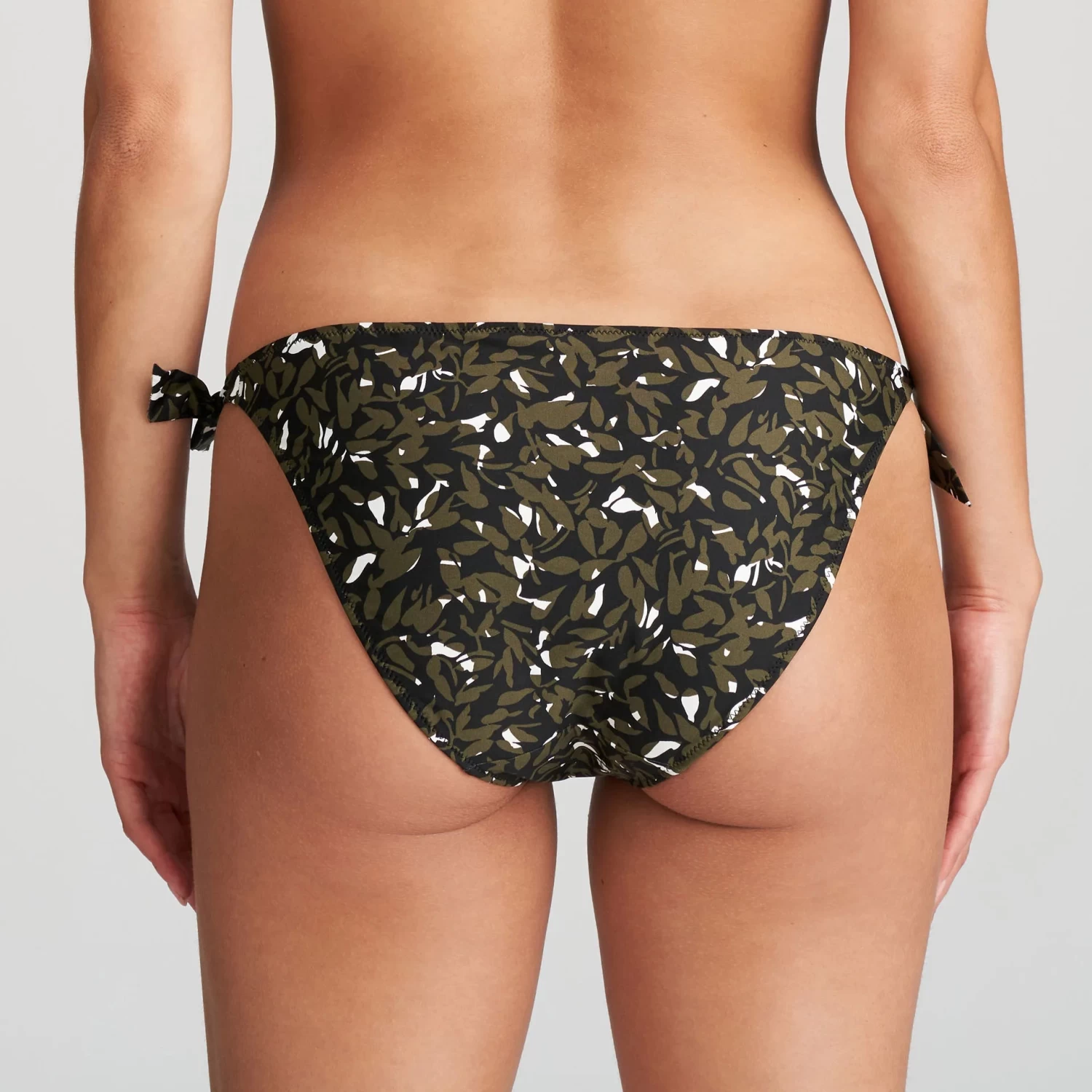 Feminine bikini briefs with decorative ties at the hips. Rainforest is a tropic jungle print in black, green, and white.