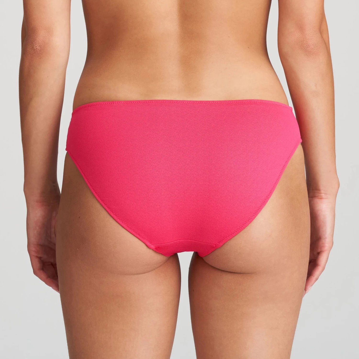 Elegant bikini briefs with sophisticated pleats and a pendant at the hip from luxury lingerie brand Marie Jo. Produced with 80% of recycled yarns. Freesia is a punchy raspberry pink. A feel-good summer colour! Pair with the Pamplona Padded Strapless Bikini Top for a fun beach holiday set!