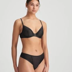 The Sleek Channing Thong from Belgian brand Marie Jo has arrived in black. It features a subtle geometric check pattern that is reminiscent of the art deco era. Â
