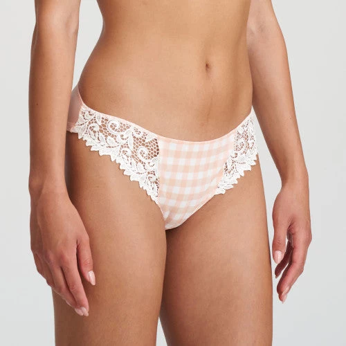 Sophisticated Rio briefs with a stylish checked print, guipure lace at the hips, and opaque peach microfibre fabric at the back. Summery checks in peach and natural. The subtle glitter adds the finishing touch to the Ely brief by Marie Jo. Pair with the Ely Padded Balcony bra for a gorgeous set!