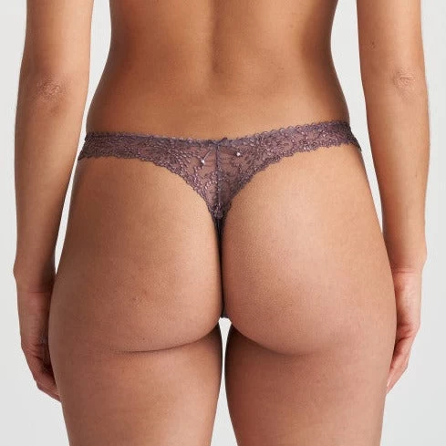 - A flattering thong with a sheer bikini-style front and a sheer narrow strip of embroidered fabric in the back. Â