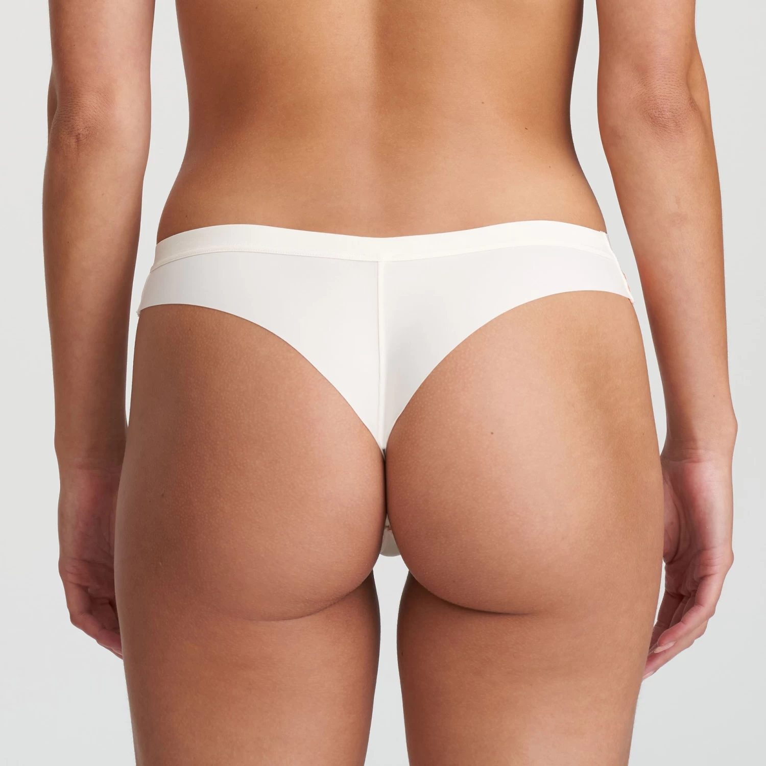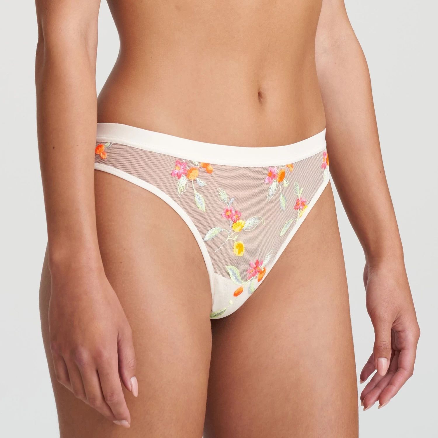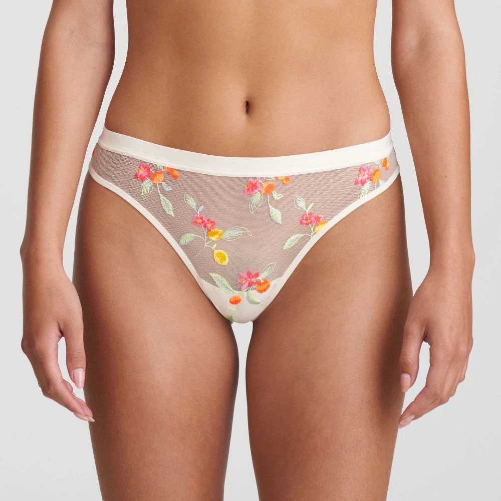 The Nagae collection from Marie Jo features a beautiful combination of sheer tulle and bright, summery embroidery. The thong brief sits low at the waist and skimpy at the back. Wear with the matching Triangle Bra for a beautiful set.Â