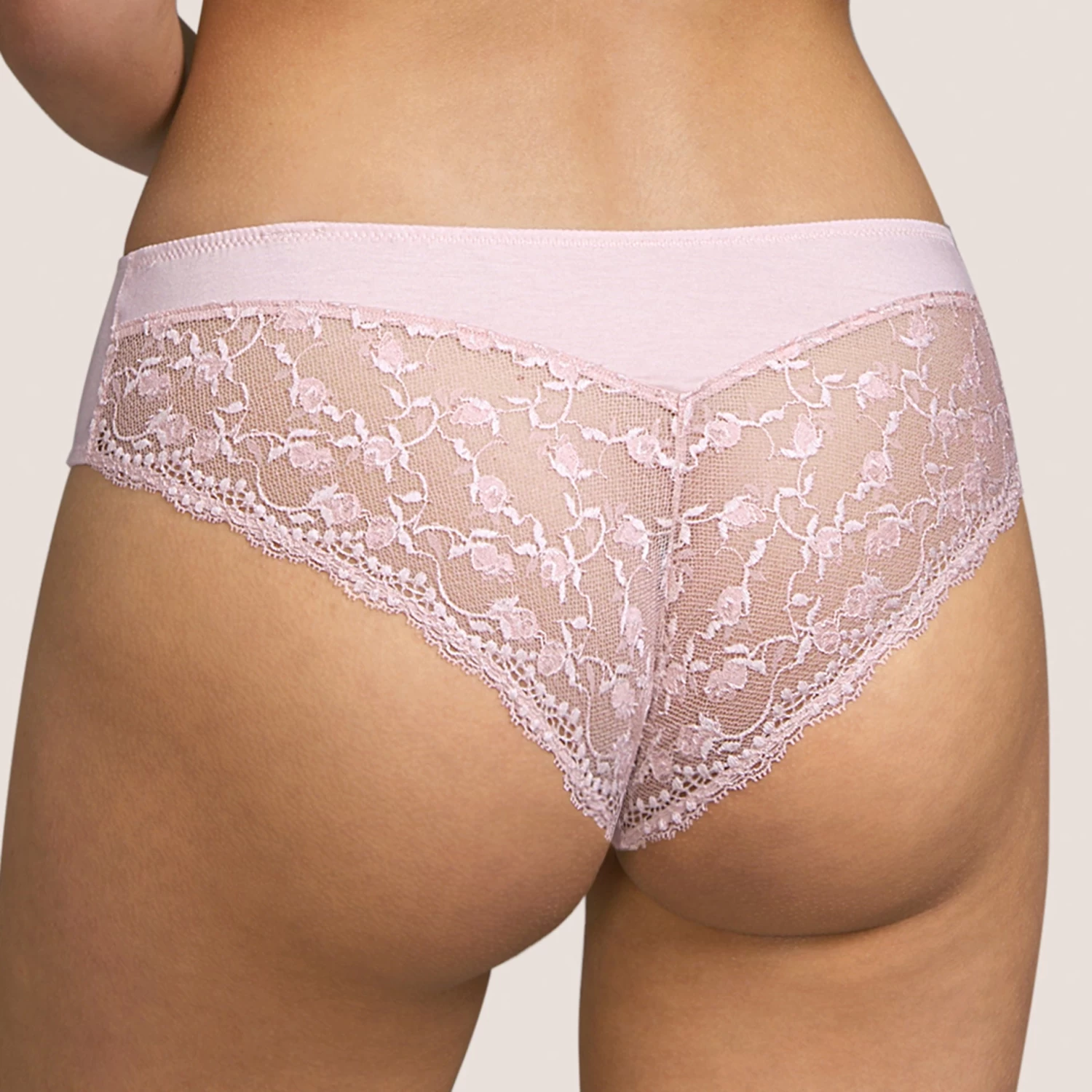 Andres Sarda is a luxury Spanish lingerie brand with a focus on premium fabrics and delicate lines. The Raven collection features stunning modal silk and delicate floral lace. This shorty style features a modest opaque front, sitting low at the hips. The back of these briefs is the true highlight, featuring sheer floral lace with a slightly high cut back. Pair with matching Raven bralette for a stunning set.Â