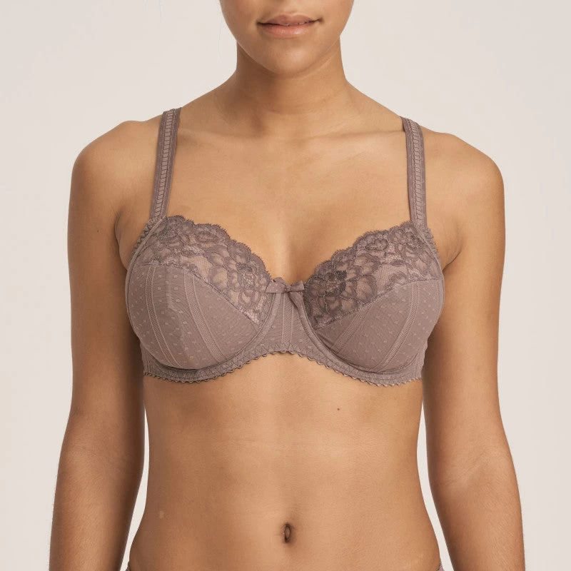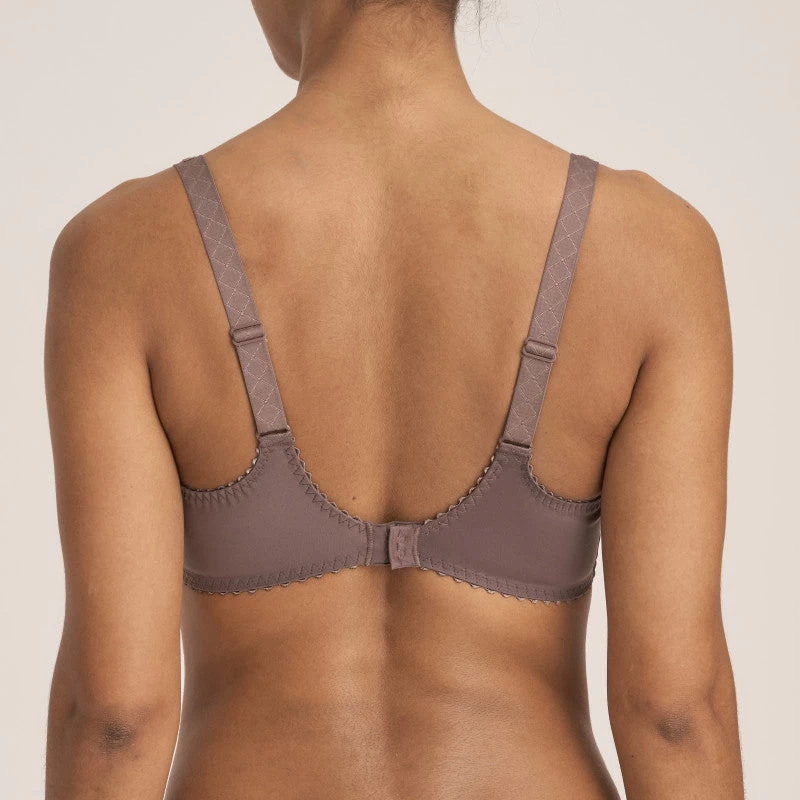 The Couture bra from Prima Donna is a fantastic lingerie staple. In this earthy neutral “Agate Grey” colour, it blends perfectly with the skin and is invisible under clothes, providing a wintery alternative to the standard nude bra. The full cup is made of a firm tulle which gives great support, whilst lace elastic in the upper cup allows for a stunning neckline.Â