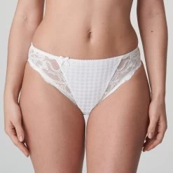 The Madison Rio brief from Prima Donna is the perfect pair for the Madison bra. These opaque “rio” style briefs are cut like the classic bikini brief, sitting low at the hip and full at the back for modest coverage. They are formed from beautiful check fabric and finished with floral embroidered lace. The briefs have recently been reimagined, so if you love this older style, now is the time to buy!