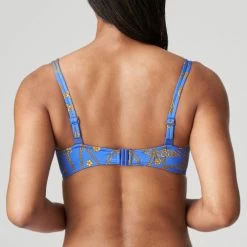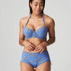 Bikini top with padded cups and a 90s-inspired print featuring gold chains from Prima Donna Swim. Gold rings on the cups and delicate spaghetti straps add the finishing touch to your retro beach look. Straight from the nineties: Electric Blue, a bright blue in a lovely print with a gold pattern. Pair with one of the many bikini brief styles for a gorgeous poolside or beach look!