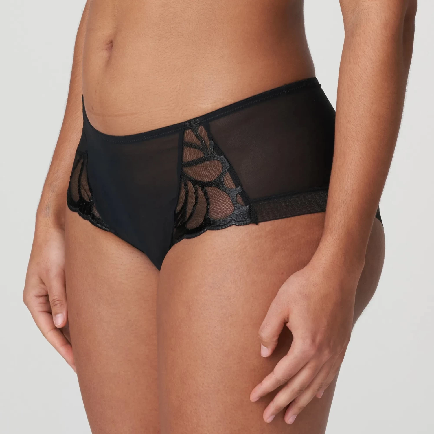 - Unique hotpant with sheer laser-cut, scalloped embroidery on the front
