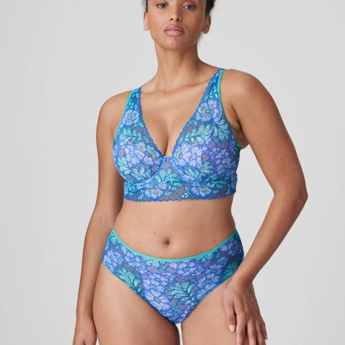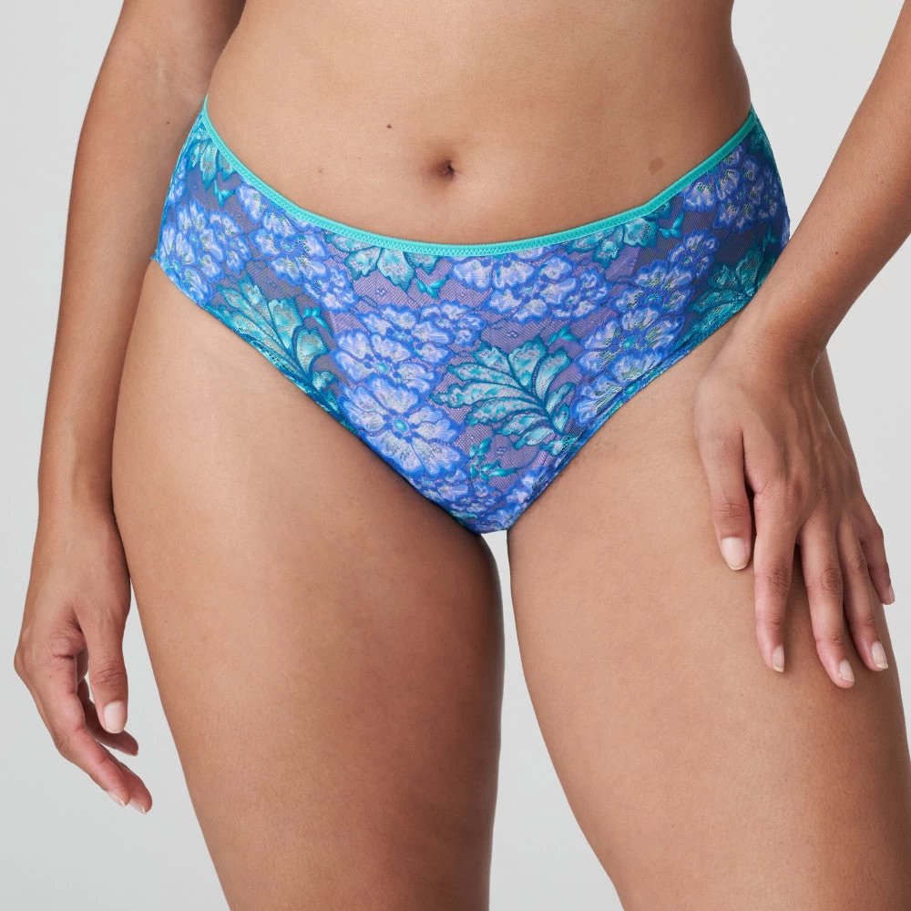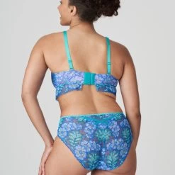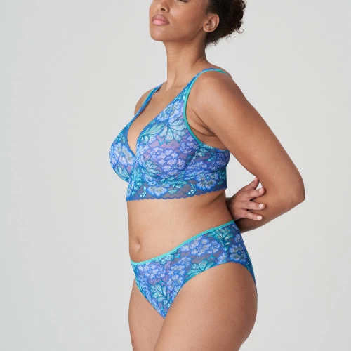 The Prima Donna Twist Morro Bay Full Brief in a gorgeous colourfully printed, recycled lace. Mermaid Blue is the colour of the Atlantic Ocean on a tropical day – Summery with a trendy hint of retro. Pair with the Morro Bay Half Padded Plunge Bra for a stunning set!