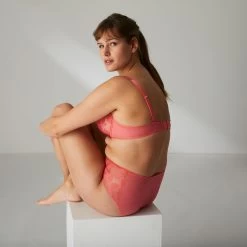 The gorgeous new Dahlia collection from French lingerie powerhouse Simone Perele combines delicate floral embroidery with a modern twist of semi-sheer tulle. The classic half cup bra shape is brought to life in the seasonal Papaya pink. With a flattering neckline that moulds the bust beautifully, and supportive underwire, this gorgeous bra is sure to be a favourite. The addition of guipure lace braiding at each shoulder, and a band of satin under the bust only elevate the elegance further. The straps are multiway, and can be worn straight over the shoulder or crossed to allow for flexibility. Pair with a variety of styles of matching Dahlia briefs for a special set.Â