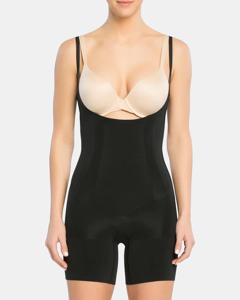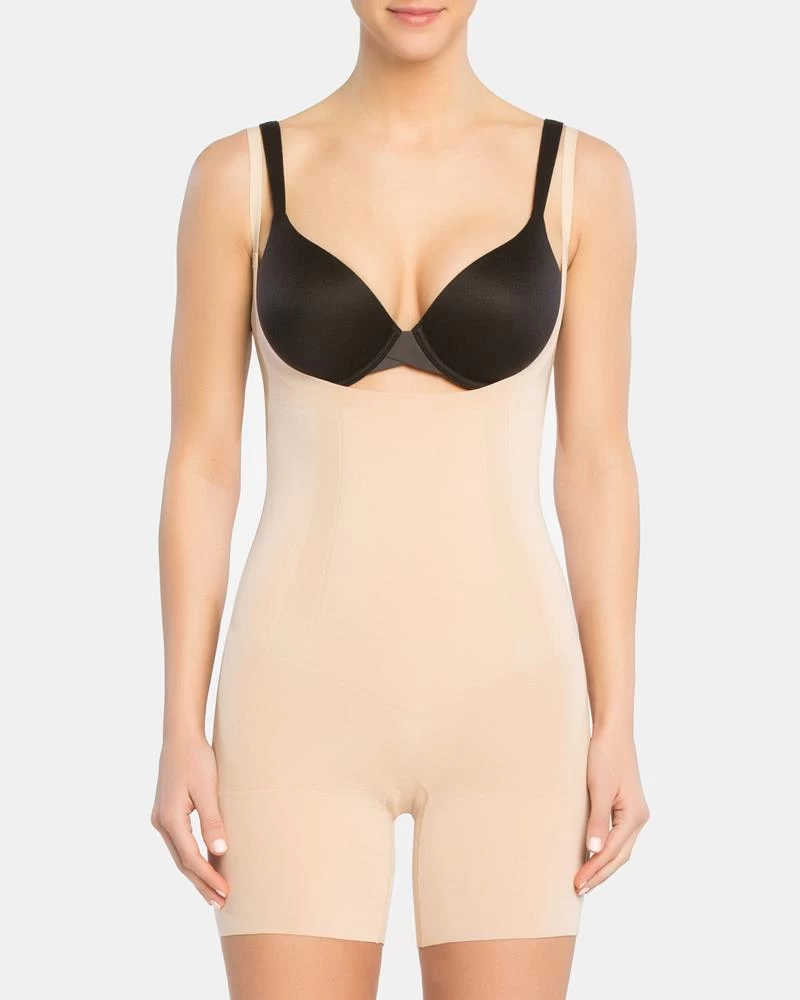 This fantastic piece of shapewear from Spanx has fully bonded front panels as well as edge-bonded side panels to create an overall slim look without squeezing or squashing. The carefully sealed neckline and underarms are designed to not irritate the skin. The leg openings are sealed to remain seamfree under clothes, and a opening at the gusset allows ease when nature calls.